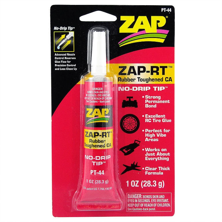 ZAP-RT (Rubber Toughened) is the newest glue product, offered with a revolutionary, patented, No-Drip Tip. Formulated for numerous hobby and craft applications in R/C Airplanes, Cars and Boats, wood, plastic, composites, rubber, etc.