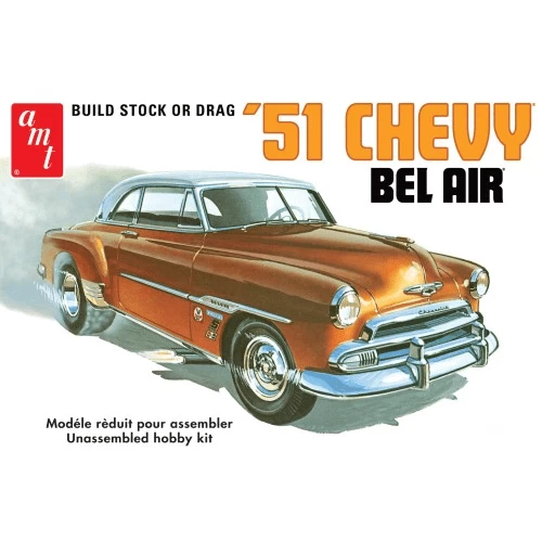 AMT presents the β51 Chevy Bel Air as a 2-in-1 Retro Deluxeβ’ release. This fun-to-assemble kit comes complete with all the parts needed to build factory stock or burly drag gasser versions. Full-color decals and exciting vintage packing graphics complete this excellent model of an early 1950s GM icon.