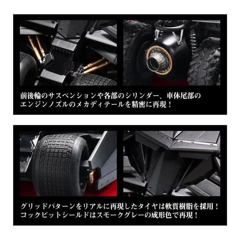 The Batmobile as seen in 2005’s “Batman Begins” is now available in model-kit form from Bandai! This 1/35-scale kit offers precise and high-quality reproduction; the exterior is made of a matte material to express the profound texture of the vehicle, and the cockpit shield is now smoke gray. Soft resin is used for the tires to realistically reproduce the grid pattern. Admire the precisely reproduced mechanical details of the front and rear wheel suspensions, cylinders, and engine nozzles. You’ll love it — order yours today!