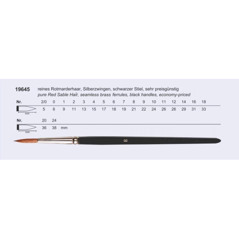 Red Sable Hair, seamless brass ferrules, black handles, economy-priced.