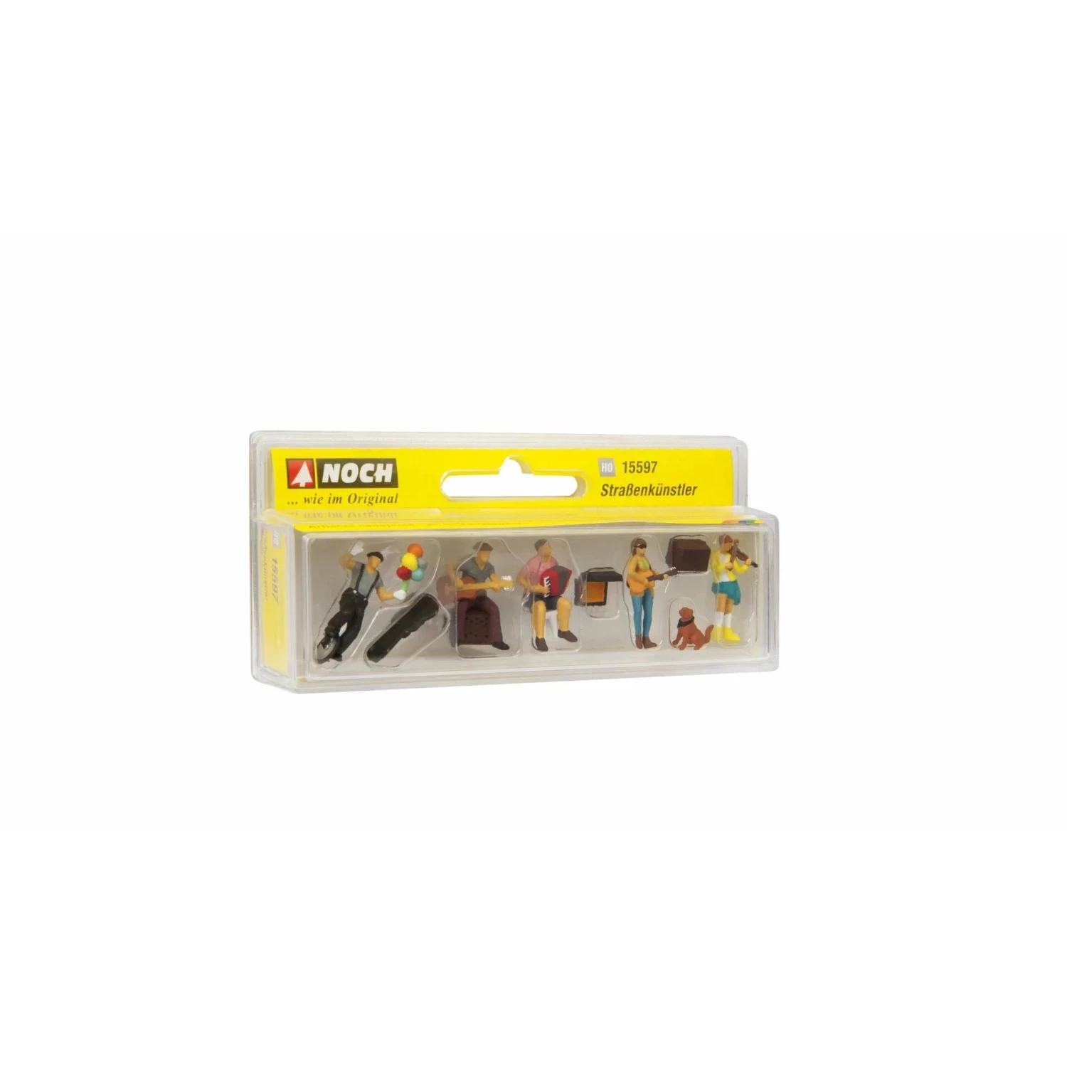 The Figures Set contains 6 figures: one standing guitar player, who is wearing sunglasses, jeans and a brown top. As well as a sitting guitar player, who is wearing dark brown trousers and a loose blue T-shirt and a hat. In addition, he has placed a guitar case on the ground in front of him for loose change. An accordion player is also included in the set. The latter is sitting on a stool with a red accordion on his lap. He is wearing a pink shirt and denim shorts. He has also put his instrument case on the ground in front of him. Another figure is playing the violin. She is wearing a yellow jacket and a short blue skirt as well as matching yellow shoes. A unicyclist with balloons completes the scene. He is wearing black trousers with braces as well as white gloves and balloons in one hand.