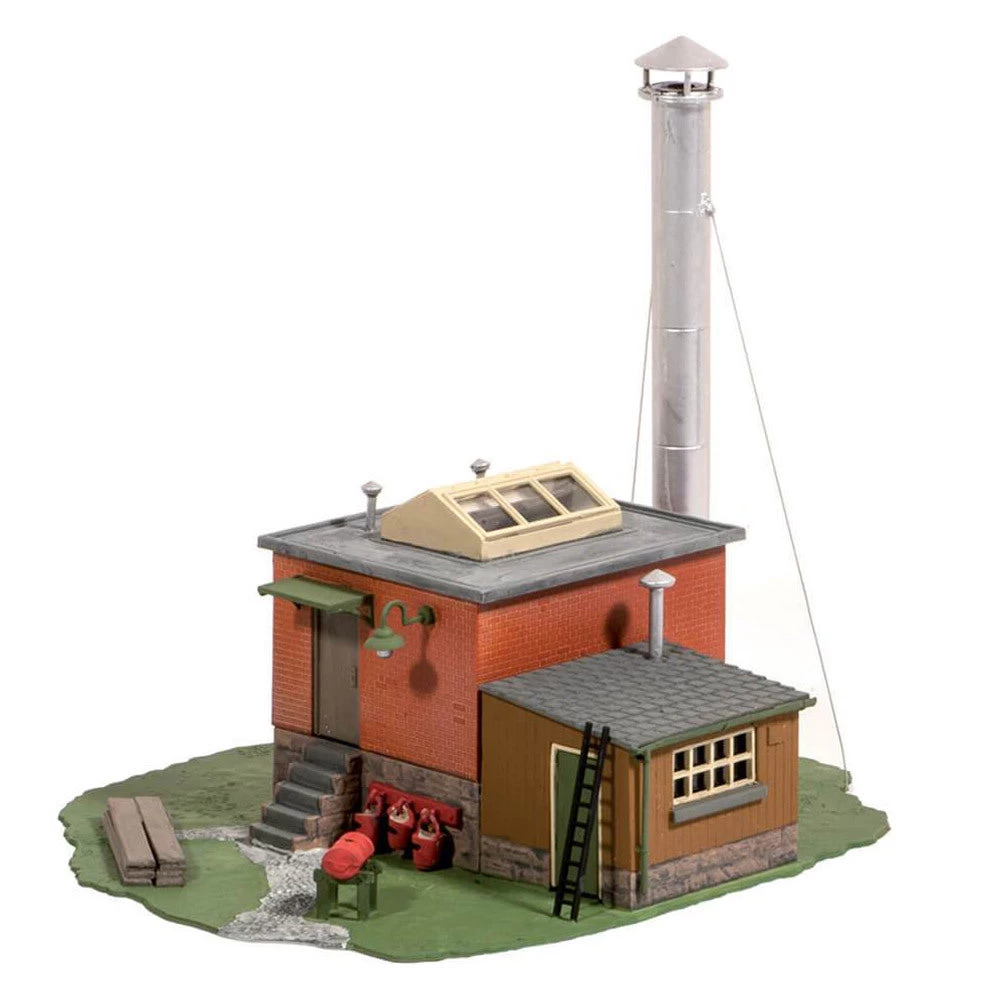 This versatile building would contain a boiler to provide steam either for a pump raising water or to generate electricity for a small factory. Supplied with pre-coloured parts although painting and/or weathering can add realism; glue is required to complete this model. Footprint 110mm x 90mm