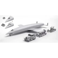 It offers the standard Silbervogel kit plus the addition of two 72nd-scale small towing trucks with two trailers, both packed with proposed atomic bombs for their mission on “Amerika”.