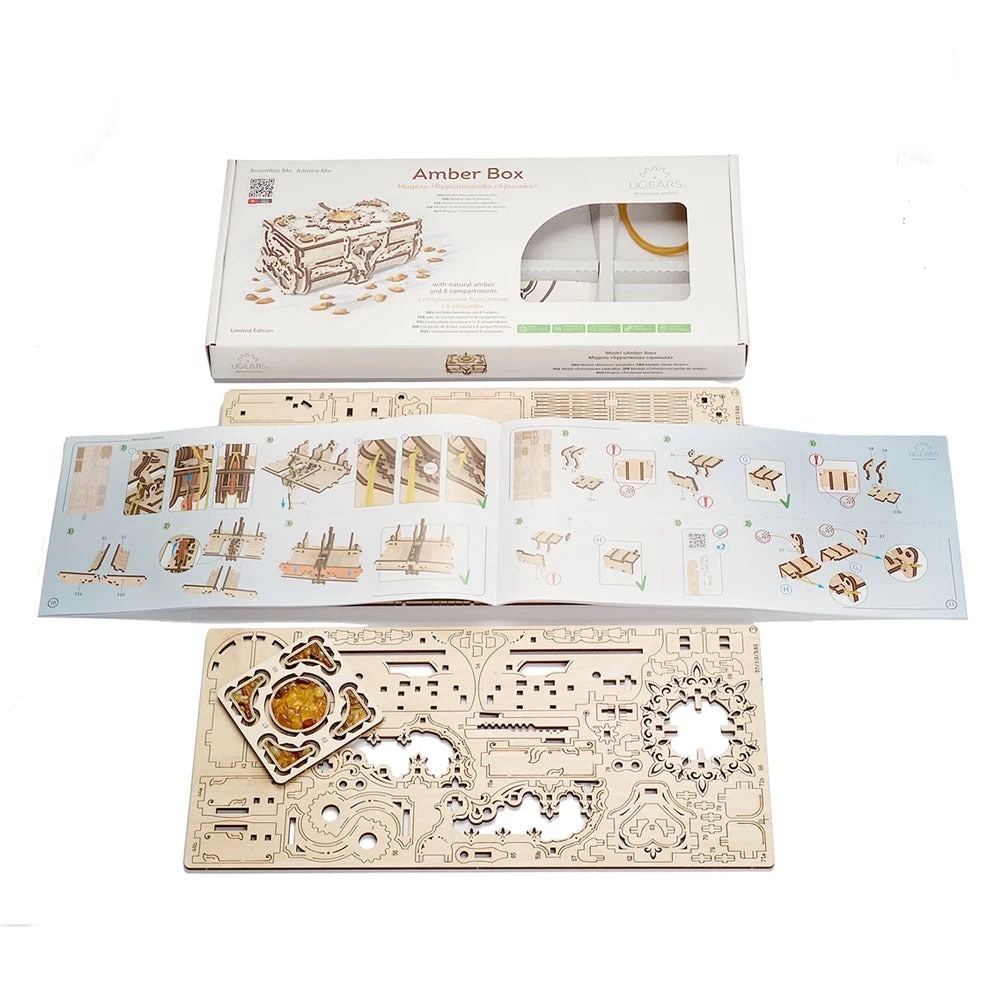 The Amber Box from Ugears, the older sister of the Antique Box, is just as beautiful and fascinating as her little sister, but even more sophisticated. This beauty has all the cool features you can enjoy in the younger model with an extra touch: cleverly built-in natural amber inclusions to make your experience even more precious.