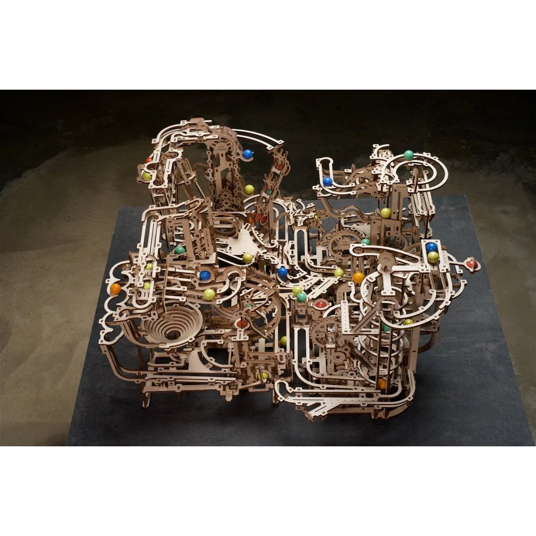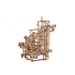 The Marble Run Spiral Hoist is the fourth model in the Ugears collection of fascinating DIY wooden mechanical marble runs. The hoist has two types of rails to speed the ascent: the main spiral rails and vertical rails. Turn the crank to lift the colored glass marbles upwards (one marble rises per nine revolutions of the winding crank) to the three-marble storage up top. From there the marbles begin their downhill runs through exciting elements: a high-speed slide, a vertical snake and a mountain river.