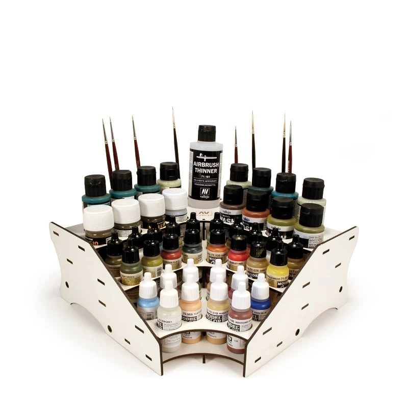 The perfect solution for storing Vallejo colours. This corner model has space for 28 bottles of Vallejo colours in the 17ml size, together wwith 16 bottles of 35ml/60ml, one 200ml bottle and 26 brushes. Easy assembly, does not require glue.