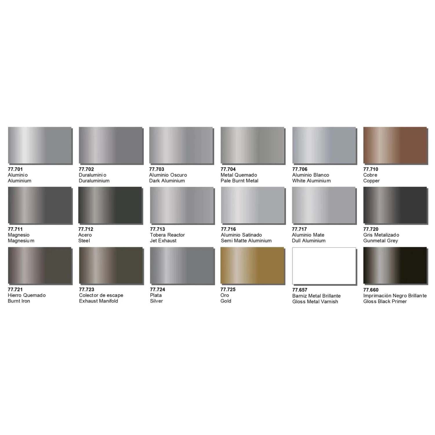Metal Color is a new range of water-based metallic colors, especially designed for airbrushing. In the development of these new and innovative metallic colors, the latest generation of aluminum pigments has been used in a specifically designed formula which results in a series of colors of exceptional resistance and adherence to plastics and metal. Metal Color can be applied directly on models without the need for the use of a primer, although in the case of fuselages and components for airplane models it is recommended to first apply a glossy Black Primer to bring forth the unique and special quality of the aluminum finish. The range of Metal Color consists of 19 references, available in 32ml. bottles with a flip top/eyedropper closure.